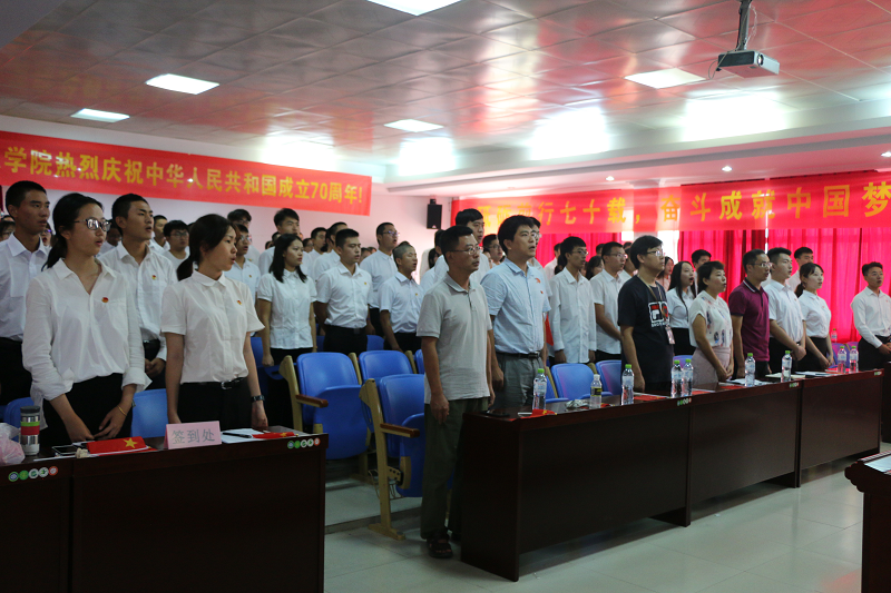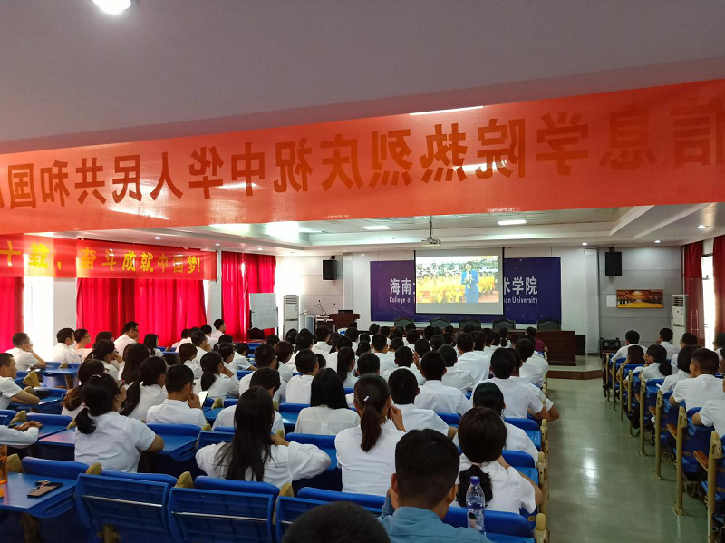 壮阔七十载,奋进新时代。10月1日上午,庆祝中华人民共和国成立70周年大会在北京天安门广场隆重举行,20余万军民以盛大的阅兵仪式和群众游行欢庆共和国70华诞。为了增强我院师生的家国情怀和民族自豪感,学院于10月1号早上8:30组织师生党员、团学干部、学生代表150余人在学院报告厅全程观看庆祝大会,学院党委书记蒙秋妍,院长黄梦醒,副院长任佳、李晖,辅导员李忠老师等一同参加了此次活动。学院党委副书记王茂钢带领27名同学在思源大礼堂观看大会直播。