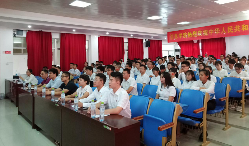 1949、1959、1969……2019,随着钟摆,年份数字依次显现。报时钟声响起,10时整,庆祝大会开始。全体师生不约而同起立,同唱国歌表达对祖国母亲的深深祝福。在庆祝大会上,中共中央总书记、国家主席、中央军委主席习近平同志发表重要讲话,他强调,中国的昨天已经写在人类的史册上,中国的今天正在亿万人民手中创造,中国的明天必将更加美好。全党全军全国各族人民要更加紧密地团结起来,不忘初心、牢记使命,继续把我们的人民共和国巩固好、发展好,继续为实现“两个一百年”奋斗目标、实现中华民族伟大复兴的中国梦而努力奋斗。令在场的师生既倍感振奋,又倍感责任重大。