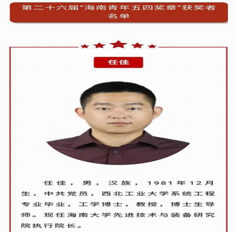 2020年五四青年节来临之际,热烈祝贺我院青年教师任佳教授荣获“海南青年五四奖章”。