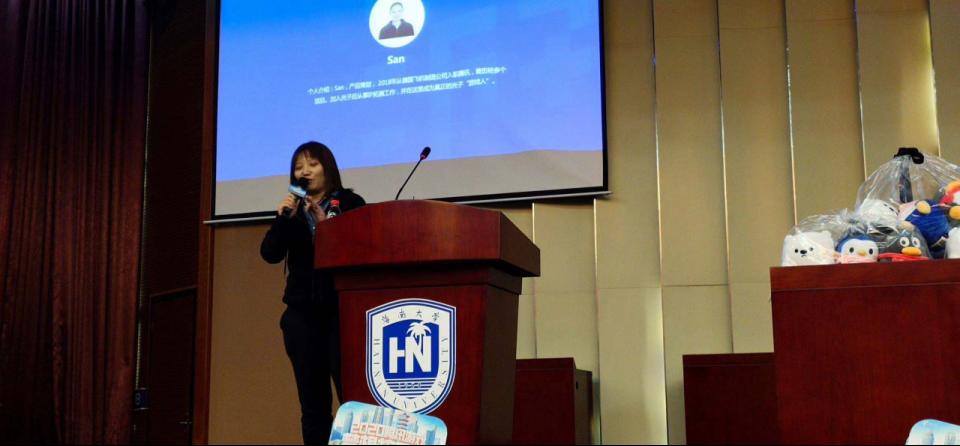 San是腾讯互动娱乐光子工作室群产品策划,2018年从德国飞机制造公司入职腾讯,曾历经多个项目。加入光子后从事IP拓展工作,并成为真正的光子“游戏人”。San向大家分享的主题是“从‘和平精英’上分玩家到真正的游戏从业人”。首先San为大家讲解了和平精英是什么;其次向大家展示了游戏里的“新鲜事”即最新的变化,比如IP内容更加丰富,包括原创、多元、联动和破图;再次为大家介绍了我们的赛事;最后San以自身为例子向大家讲述如何从一个游戏爱好者转变到游戏从业人。还为同学们提出一个探讨问题:关于游戏的沉浸式体验,大家围绕这个问题积极互动,踊跃发言。