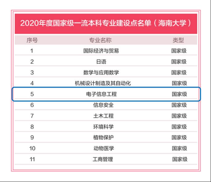 近日,根据教育部发布的《教育部办公厅关于公布2020年度国家级和省级一流本科专业建设点名单的通知》(教高厅函〔2021〕7号),我院电子信息工程专业被教育部认定为国家级一流本科专业建设点,此举将大力推动我院实施一流专业建设“双万计划”,将有利于人才培养能力和高等教育质量的全面提升,为服务海南自贸港建设提供重要的人才支持。