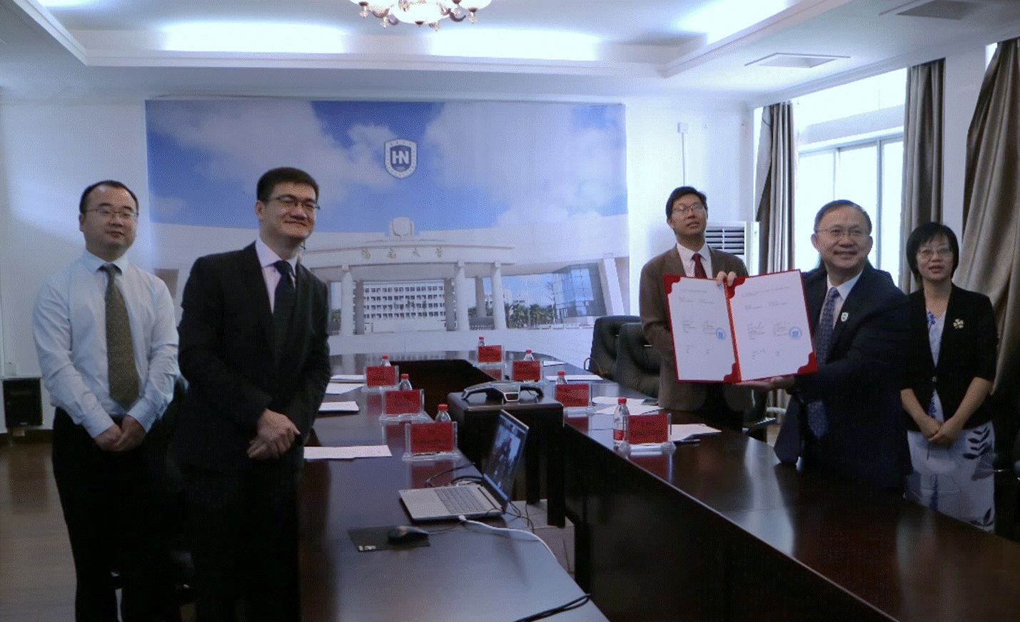 海南大学校长、中国科学院院士骆清铭,副校长叶光亮,国际合作交流处(港澳台办公室)处长杨志昕、副处长林仕岛,教务处副处长耿刚,william威廉亚洲官方院长黄梦醒、副院长毋媛媛出席现场签约仪式,副校长邱锡光在儋州校区线上参会。怀卡托大学校长Neil Quigley,资深常务副校长Alister Jones,副校长Geoff Holmes,国际处处长Sharon Calvert,国际处国际项目副处长Ed Weymes、Mu Lan,计算机与数学科学学院院长Eibe Frank,国际处国际项目运营经理Vijay Kumar,怀卡托大学驻项目代表Bernard Li出席线上仪式。