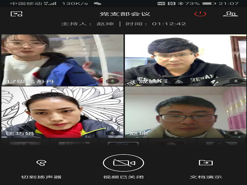 在视频会议上,每位与会同志将自己的所处位置、身体状况、工作学习进度以及帮扶对象做了简单汇报。其中,支部两位湖北藉党员彭潜、熊壮身体状况良好,并响应国家和学校的号召在家隔离尚未外出。与此同时,大家在居家的时段,也通过MOOC、智慧树等网络学习平台进行学习,提升自我。