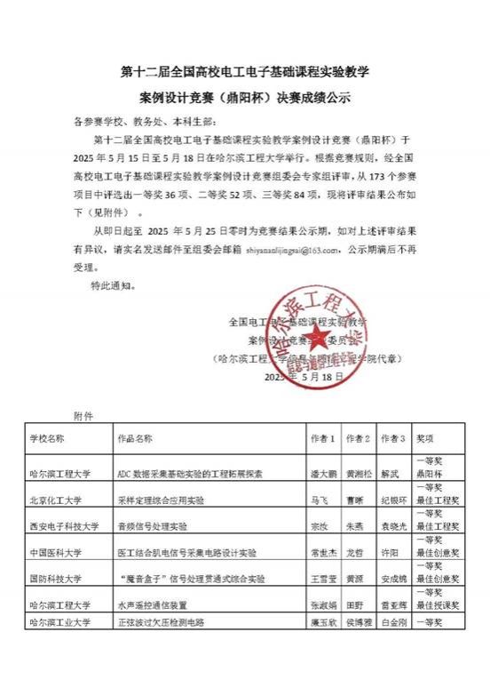 2025年5月15日至18日,第十二届全国高校电工电子基础课程实验教学案例设计竞赛(鼎阳杯)全国总决赛在哈尔滨工程大学举办。经过现场激烈角逐,海南大学william威廉亚洲官方教师崔亚妮团队荣获全国一等奖、徐博团队荣获全国二等奖。