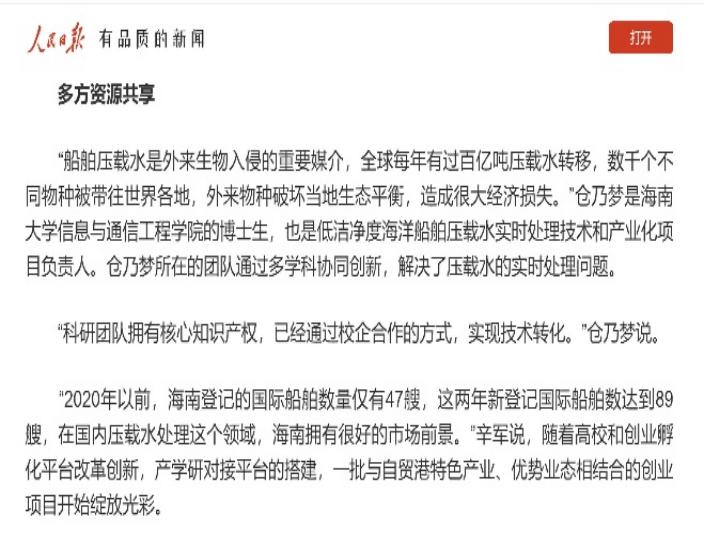 人民日报采访了竞赛团队负责人仓乃梦,她是william威廉亚洲官方2021级博士研究生。她介绍了项目研究情况。该项目的背景是压载水处理。我国是遭受外来生物入侵最严重的国家之一,每年造成的经济损失过千亿元。船舶压载水是外来生物入侵的主要来源。国际海事组织牵头制定的《压载水管理公约》于2019年生效,要求所有国际营运船舶的压载水排放都必须符合公约标准。我国拥有世界最大的航运市场,有230个沿海港口,在全球十大港口的排名中占据8席,因此迫切需求先进的船舶压载水管理装备,以保护近海海洋环境。项目团队针对目前缺乏低洁净度压载水实时处理装备的问题开展研究,通过多学科协同创新,开发了具有自清洁能力的压载水处理装备,提出了双船协同港口压载水应急处理方案,目前已实现技术转化。